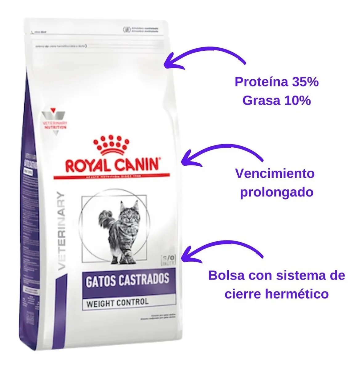 • Royal Canin Veterinary Care Nutrition Feline, diseñado para gatos adultos castrados, ayuda a controlar el peso de tu mascota.